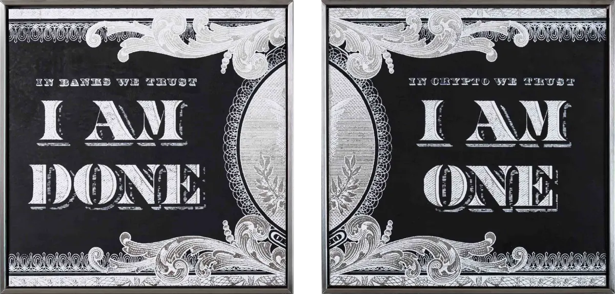 This work addresses the complexity and fragility of the traditional monetary system through the iconography of a totally white dollar. The choice to deprive the symbol of its usual pigmentation is intentional: an act of visual erasure that aims to highlight the lack of real substance behind the value assigned to paper money. The absence of color represents the abstractness of money, challenging the viewer to reflect on the concept of value.